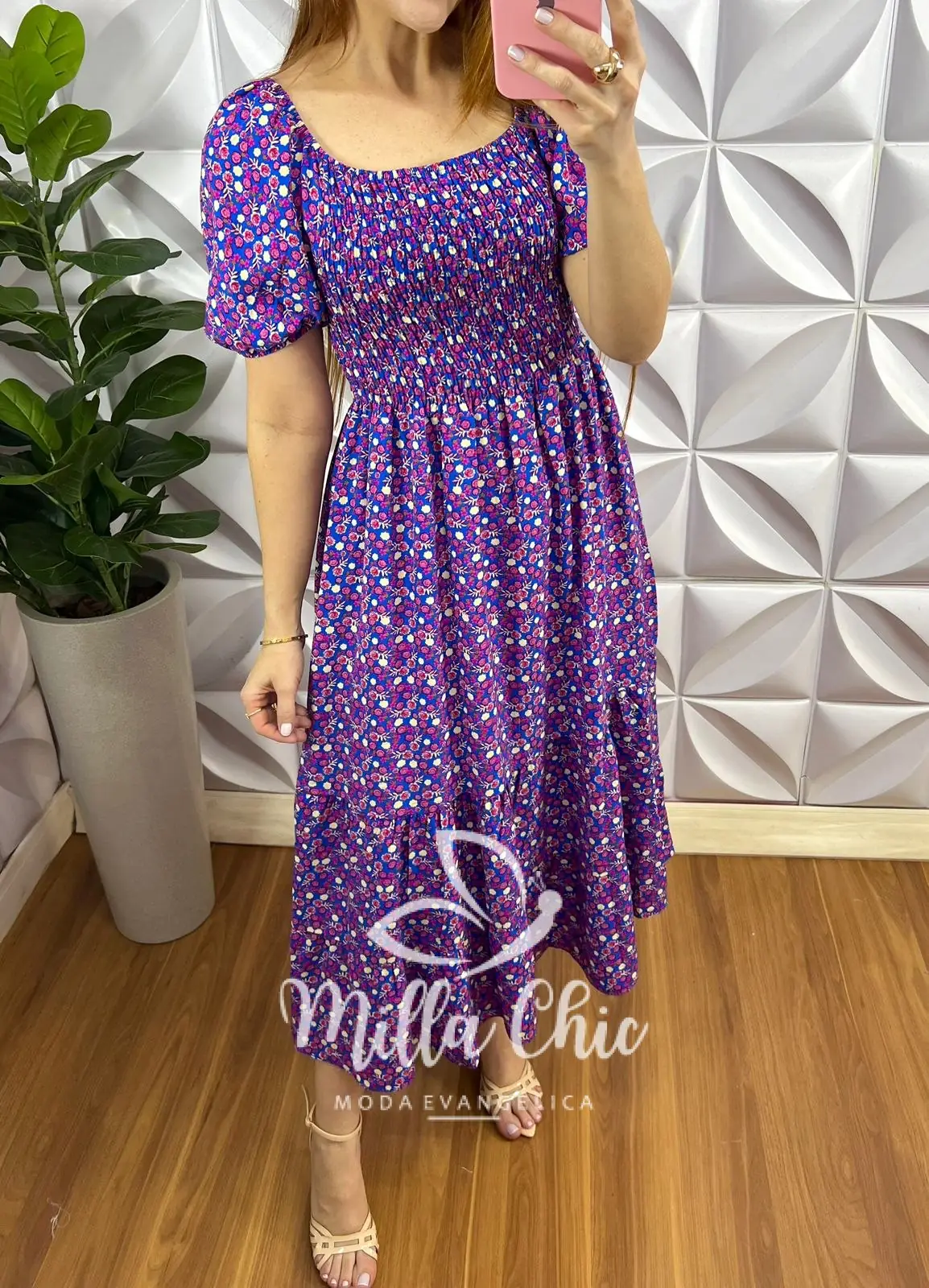 Vestido Viscolinho Estampado Longo Com Lastex Cilene - Azul Com Roxo - Milla Chic