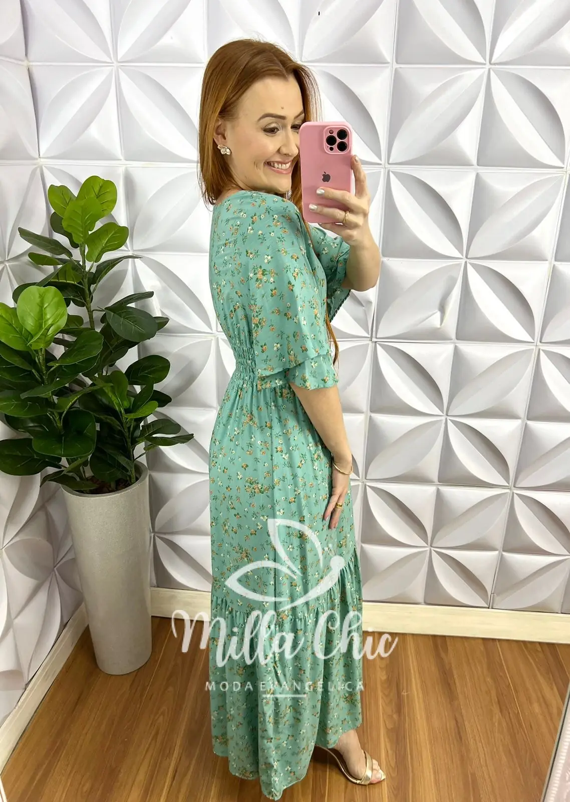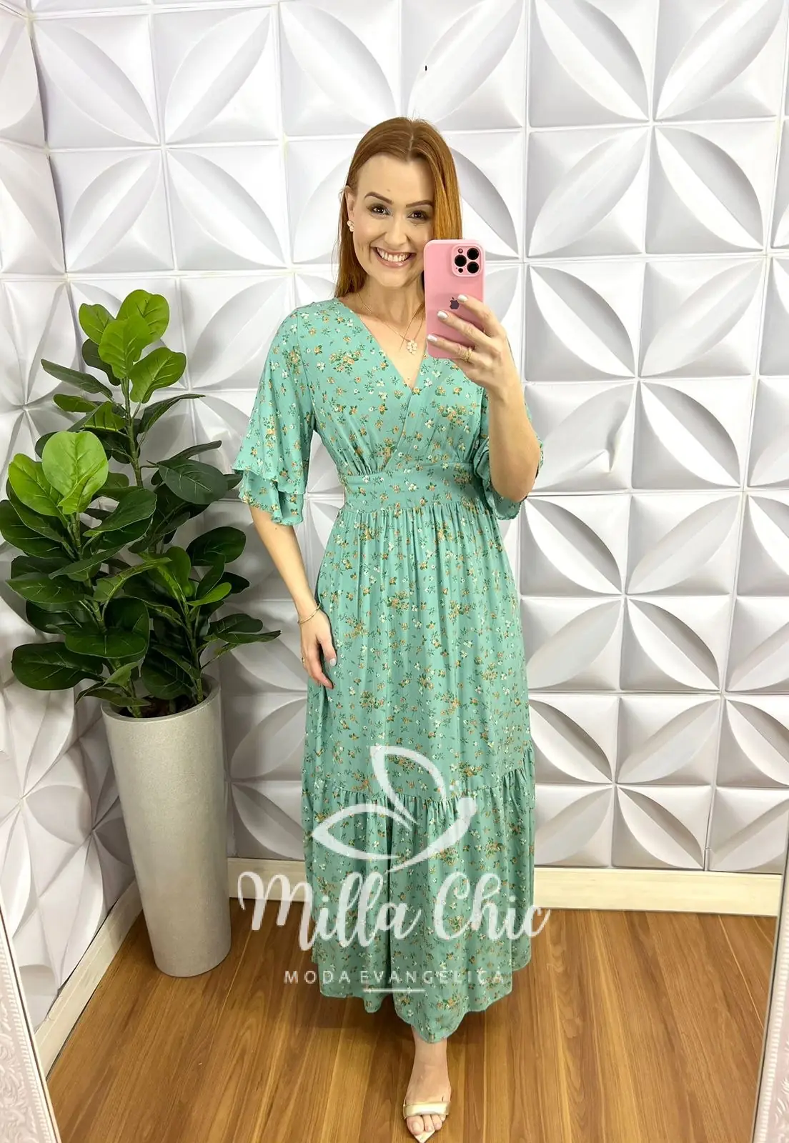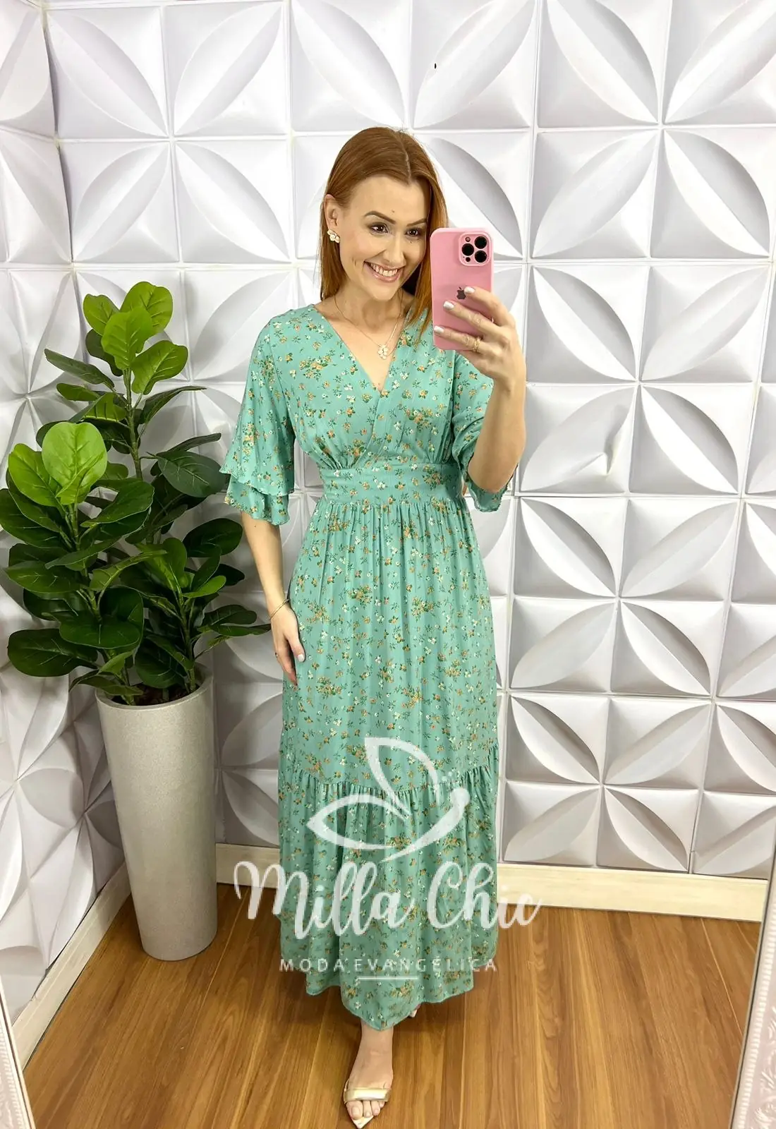 Vestido Viscolinho Longo Manga Dupla Raglan Estampado Floriana - Verde - Milla Chic