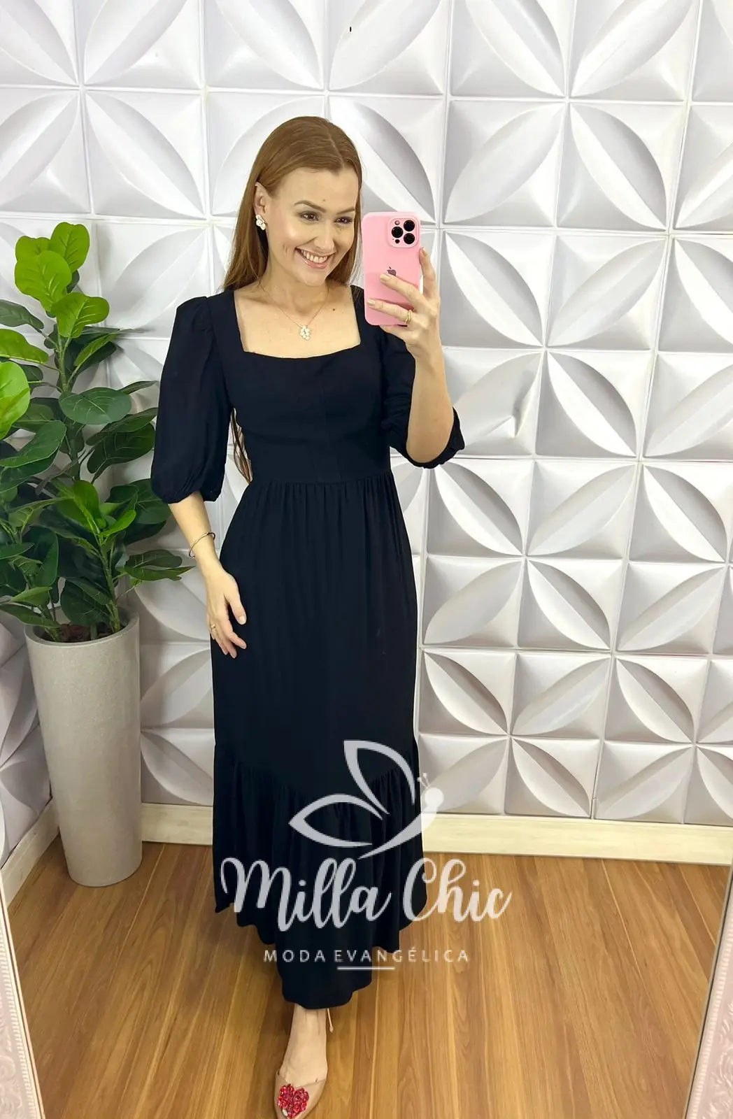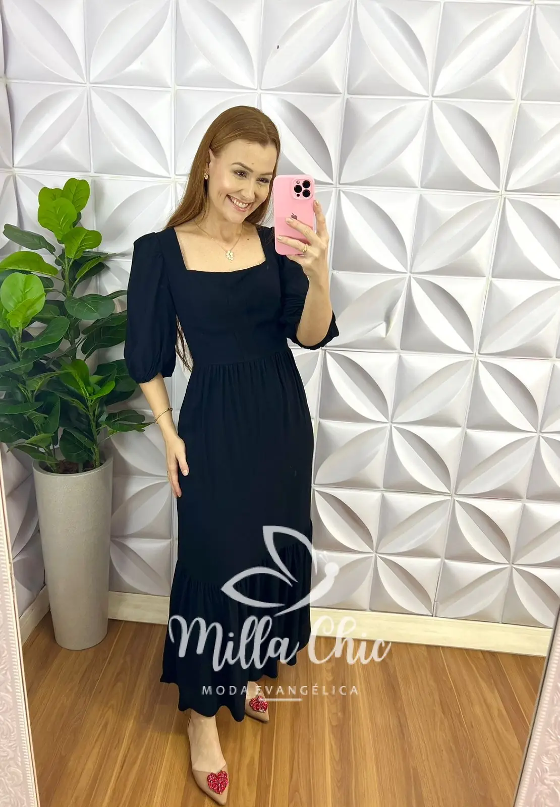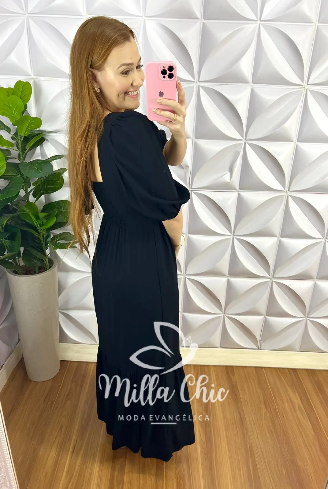 Vestido Viscolinho Maquinetado Longo Juju - Preto - Milla Chic