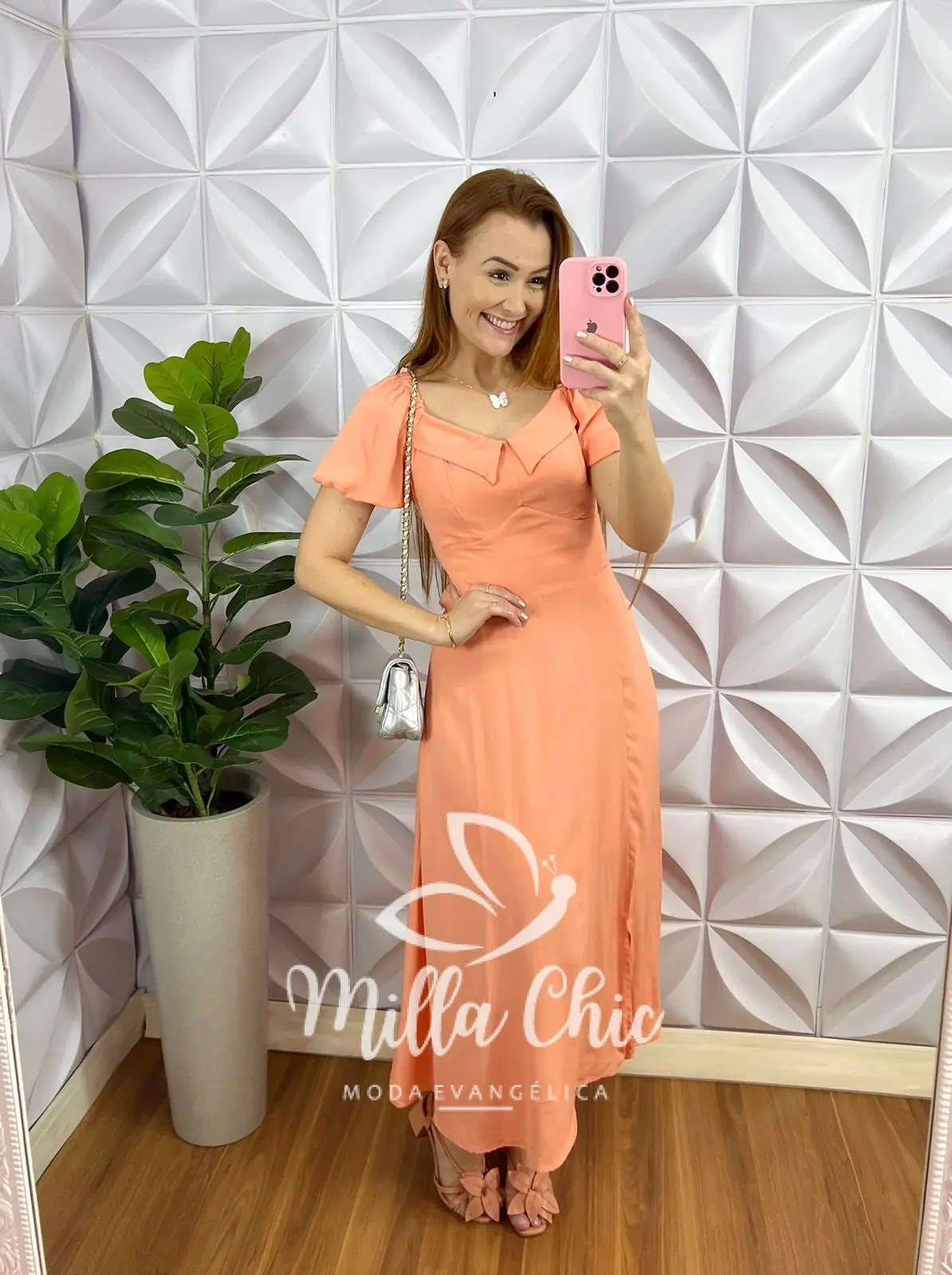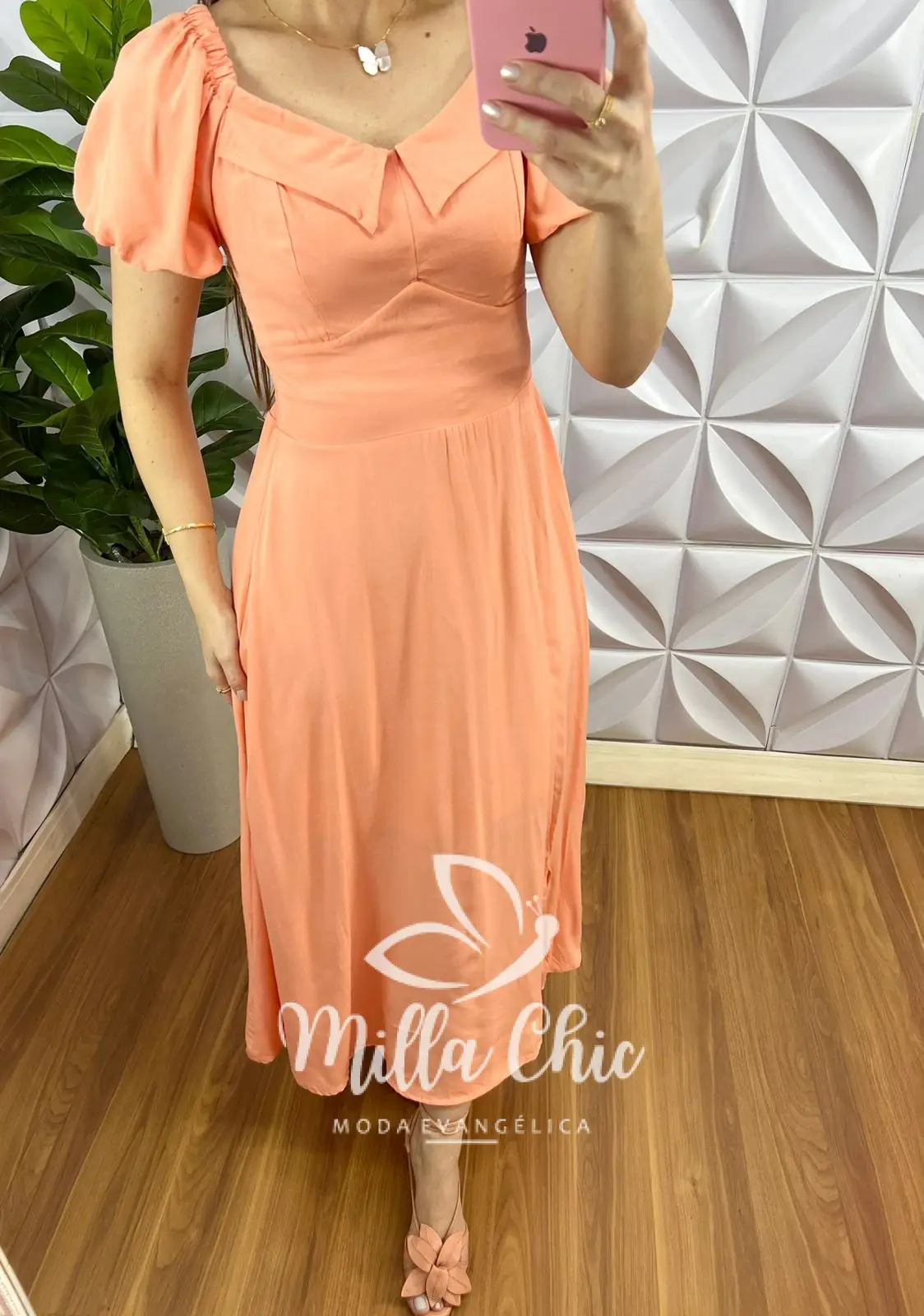 Vestido Viscolinho Mídi Com Gola Lastex Nas Costas Elisa - Pêssego - Milla Chic
