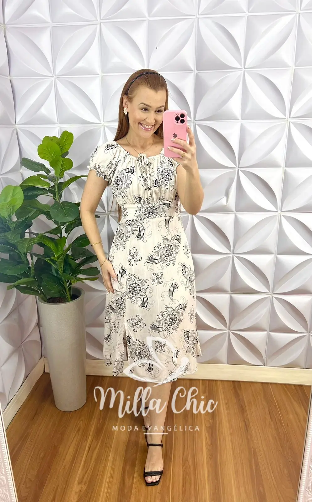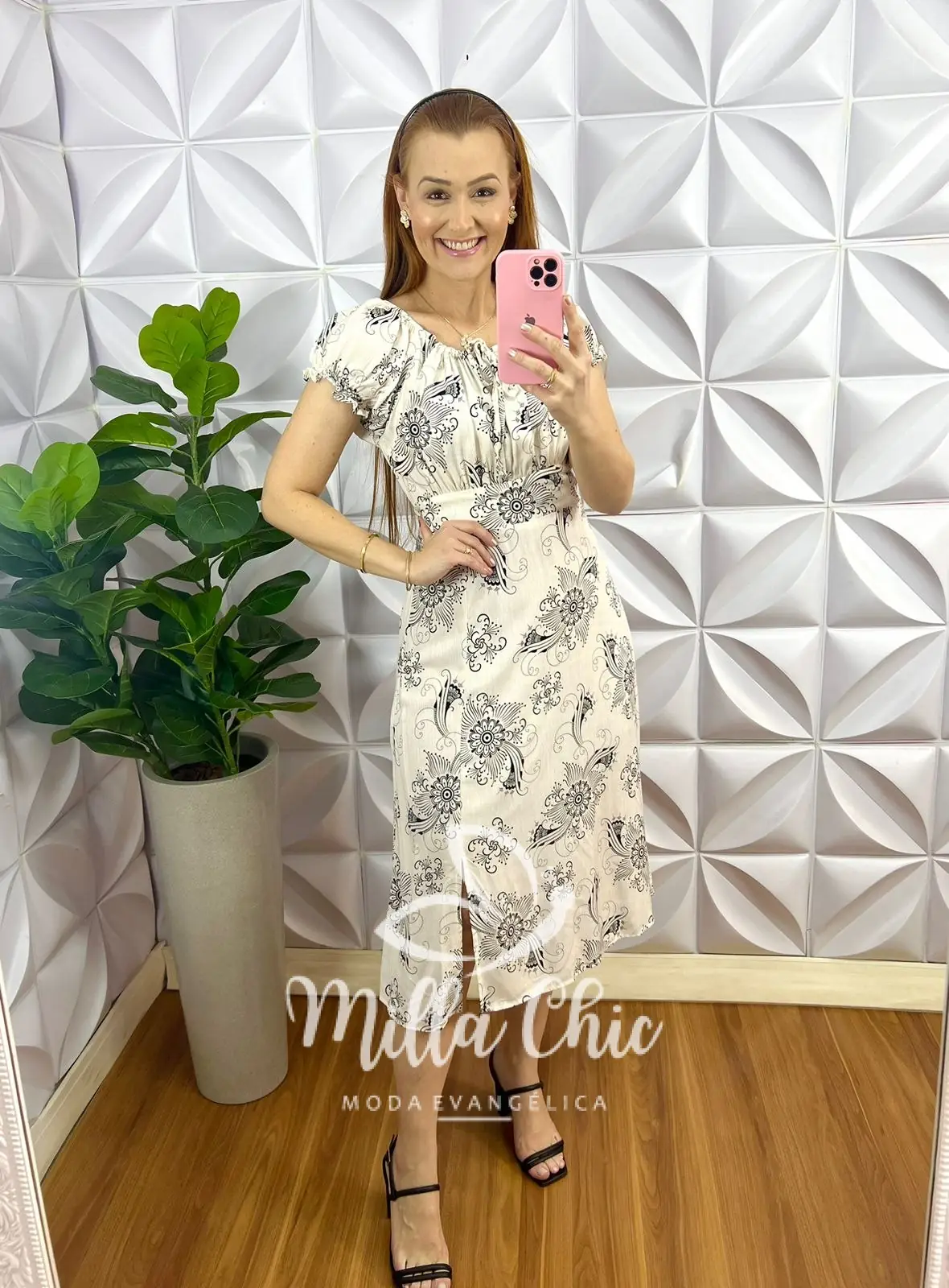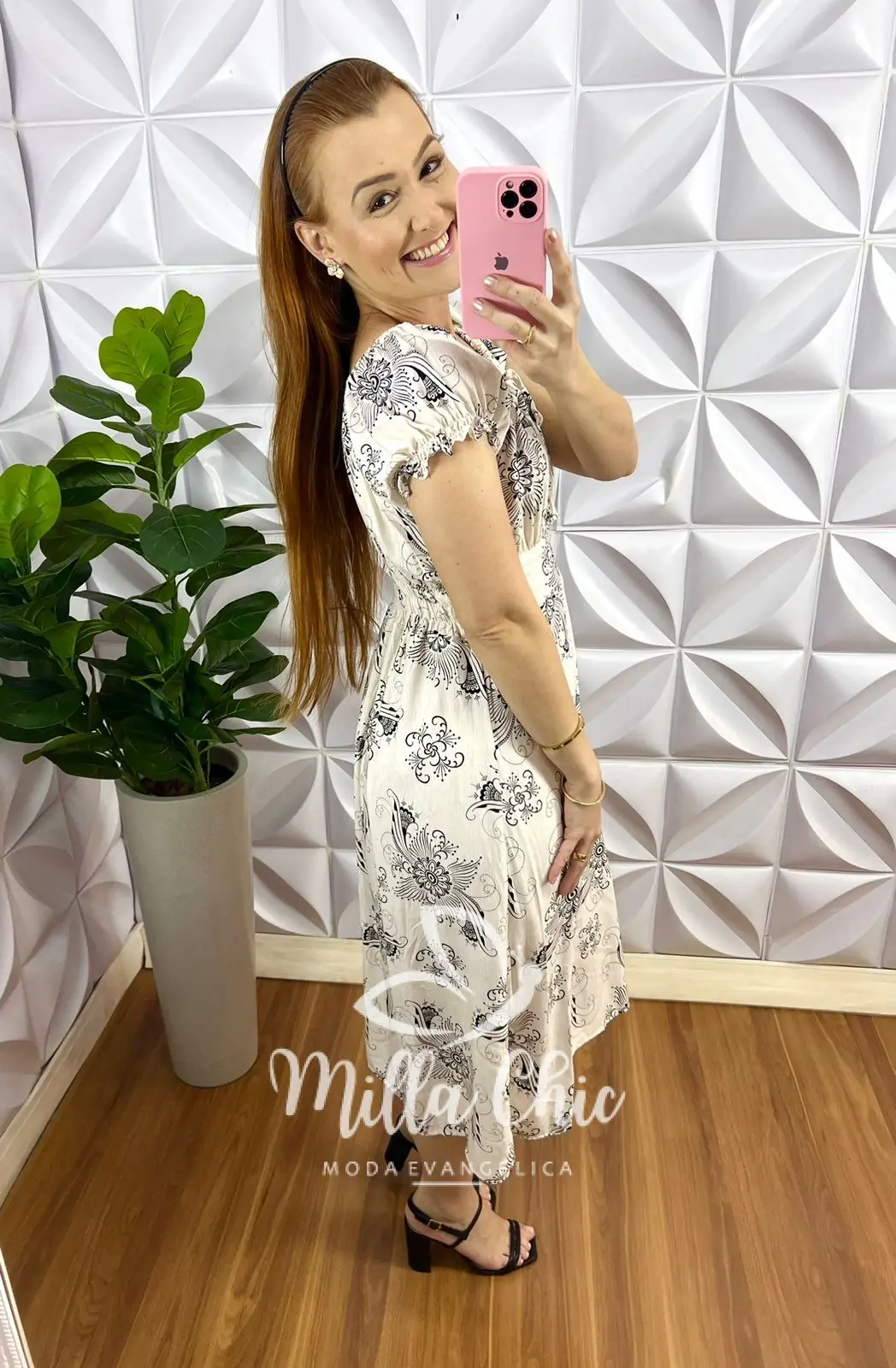 Vestido Viscolinho Mídi Com Lastex Estampado Denise - Preto - Milla Chic