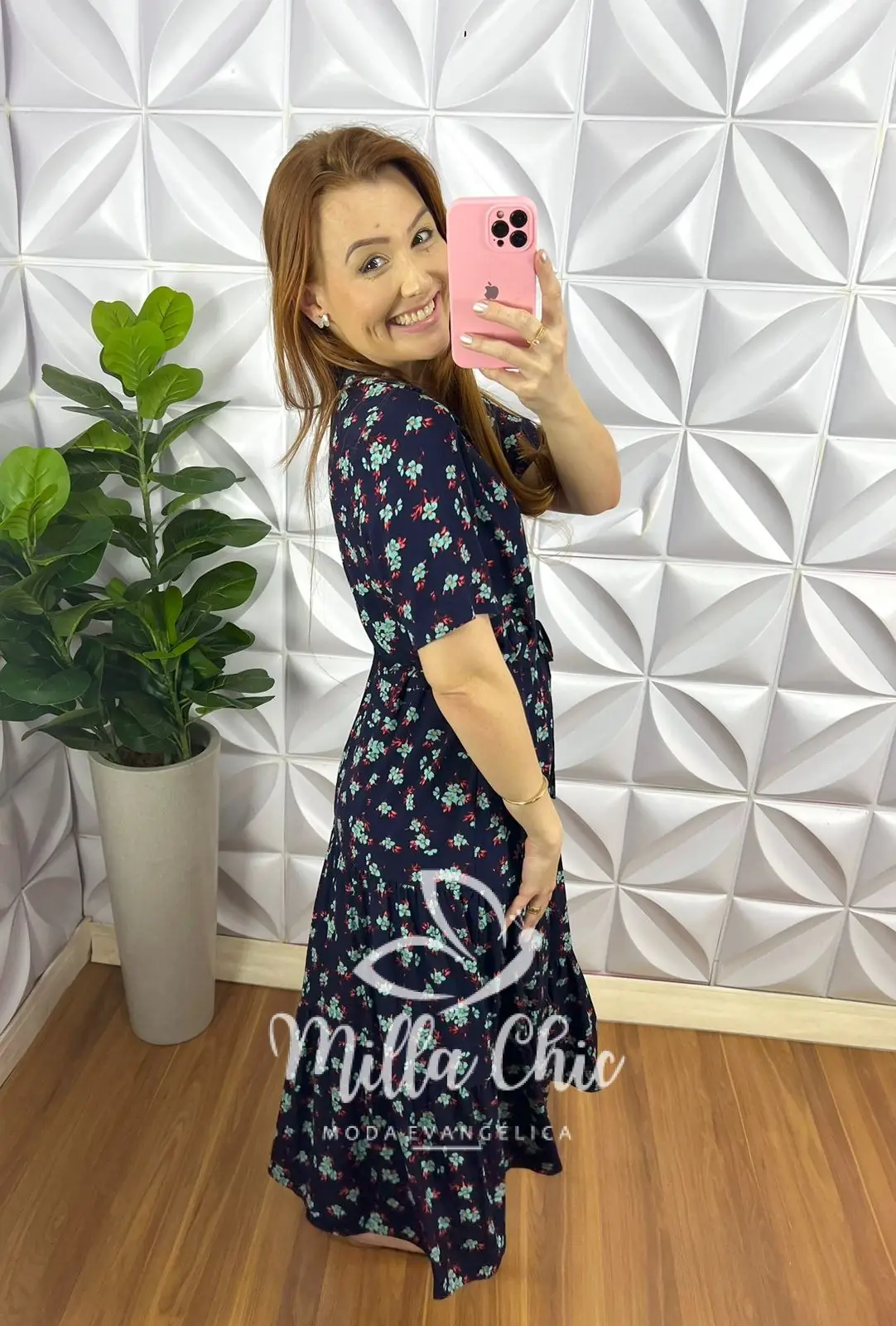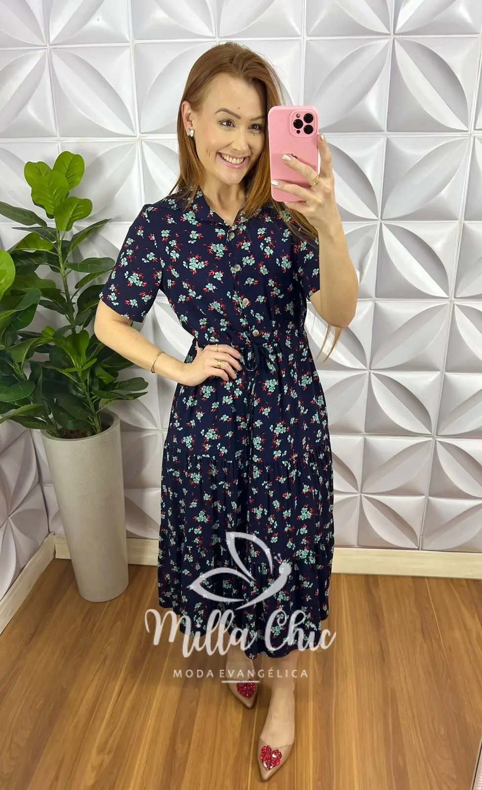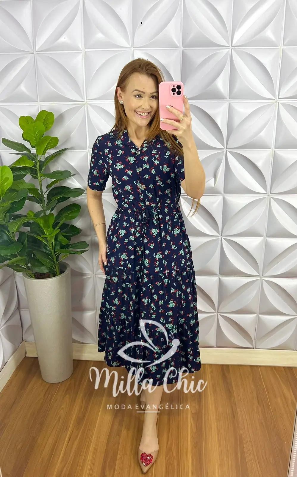Vestido Viscolinho Mídi Com Regulagem E Botões Caroline - Azul - Milla Chic