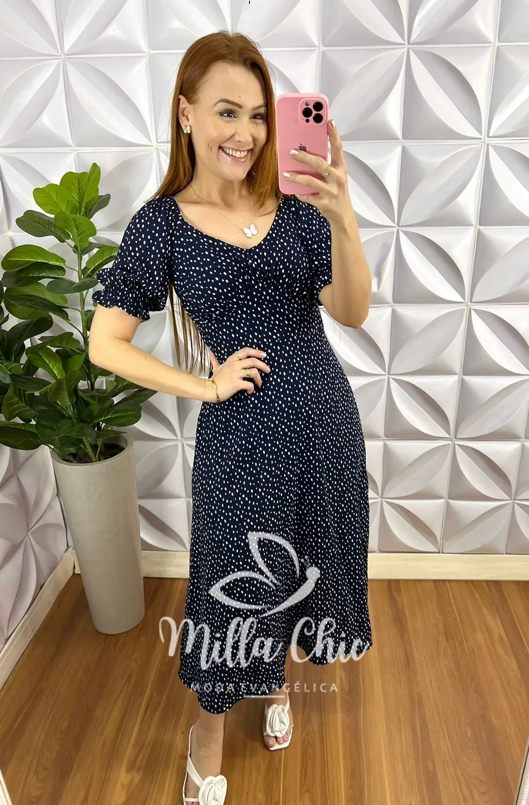 possui: Decote V, Elástico na manga para vestir bem, drapeados abaixo do busto, bojo apenas no tamanho unico, manga princesa 3/4, elástico na barra, pala larga na cintura e lastex nas costa para deixar bem cinturado, comprimento Mídi com fenda lateral. caimento evase, forro na saia.