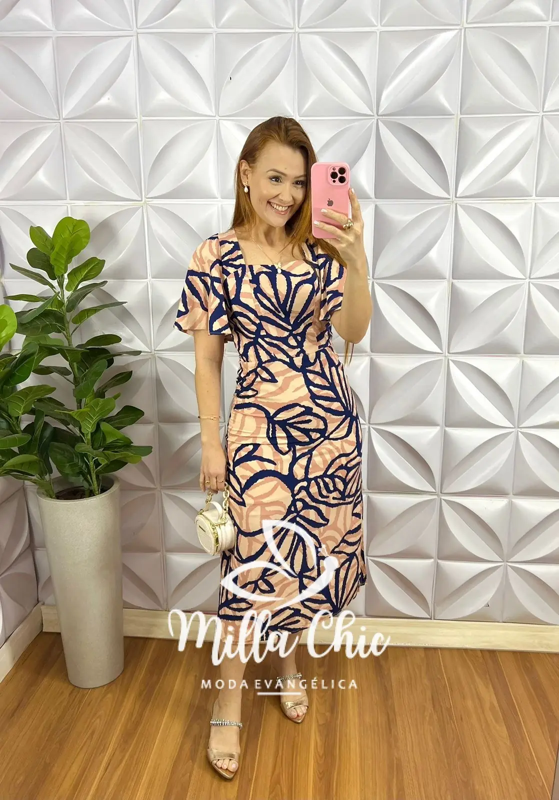 Vestido Viscolinho Mídi Estampado Com Zíper Caimento Reto Nelly - Rosa - Milla Chic
