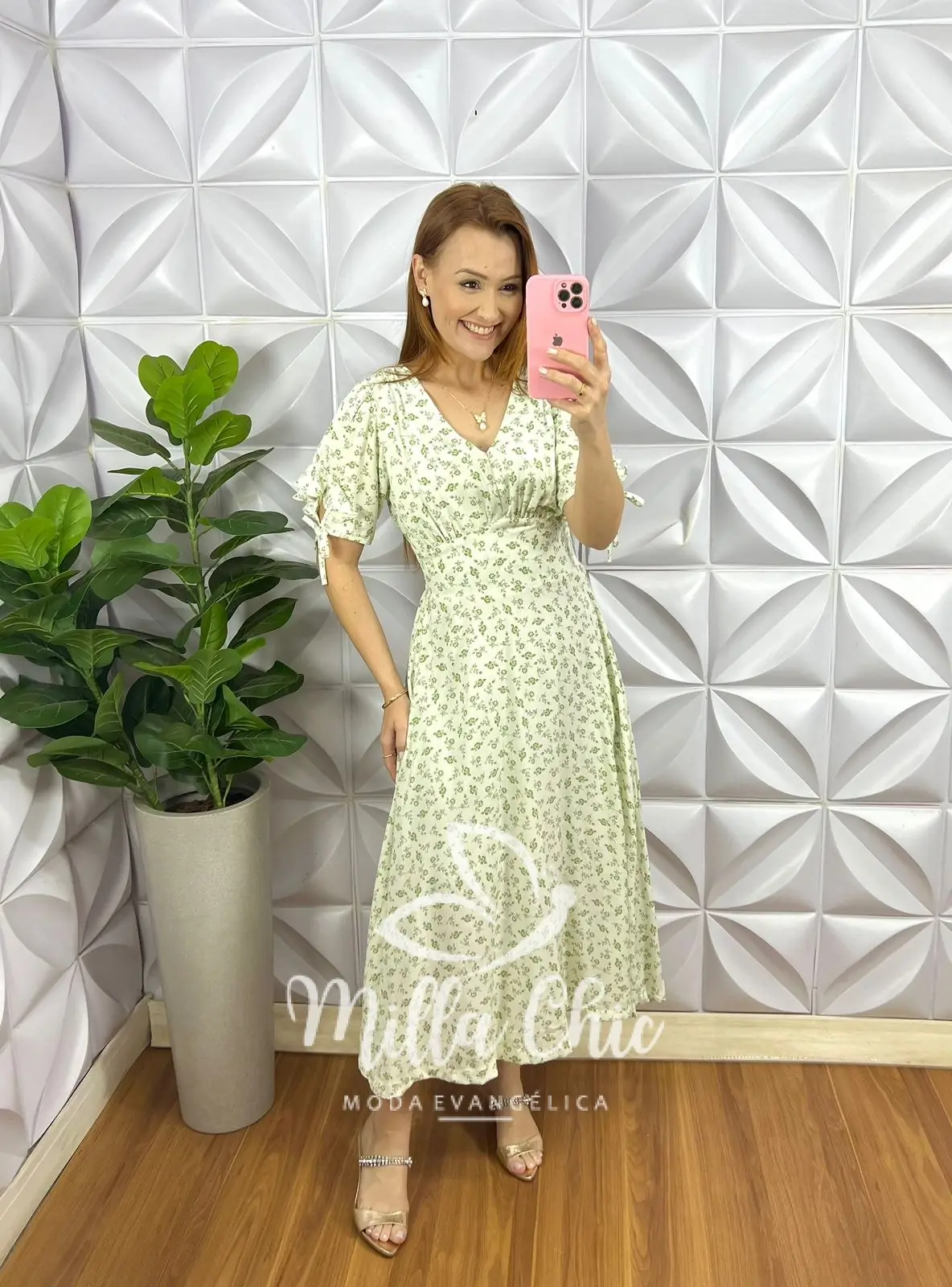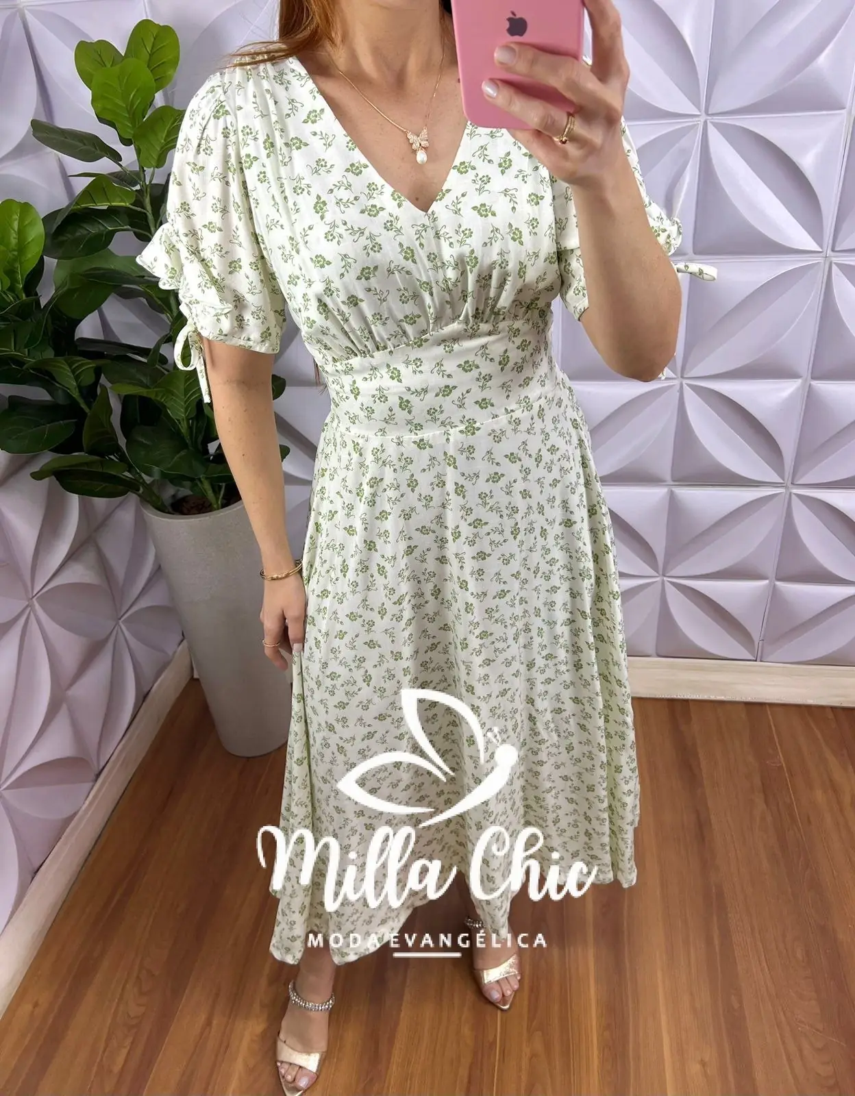 Possui: decote V, drapeados abaixo do busto, pala na cintura, lastex nas costa, manga com babadinho na barra e fita para laço, comprimento Mídi com fenda lateral, caimento levemente godê, forrado na saia.