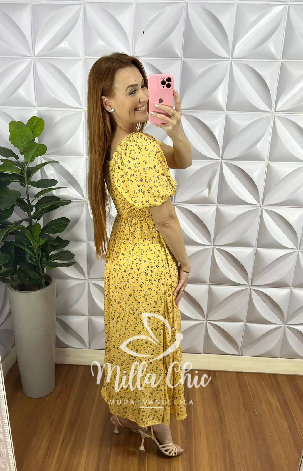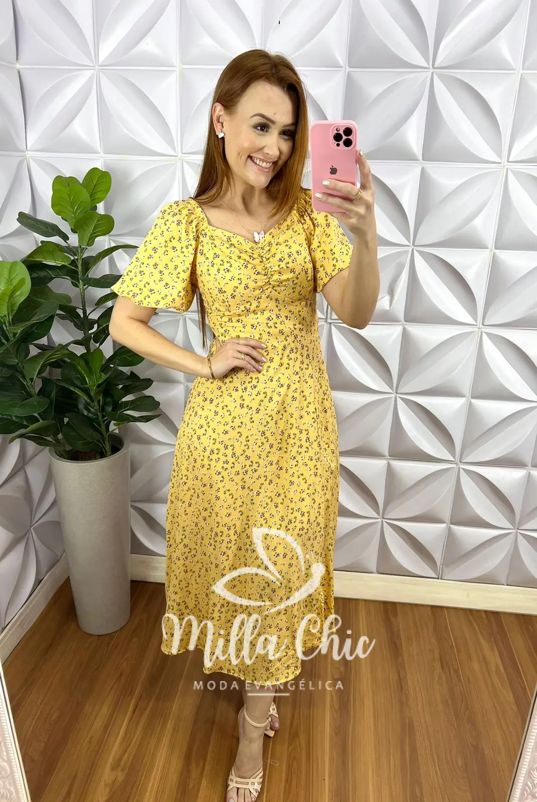 Vestido Viscolinho Mídi Estampado Sheila - Amarelo - Milla Chic