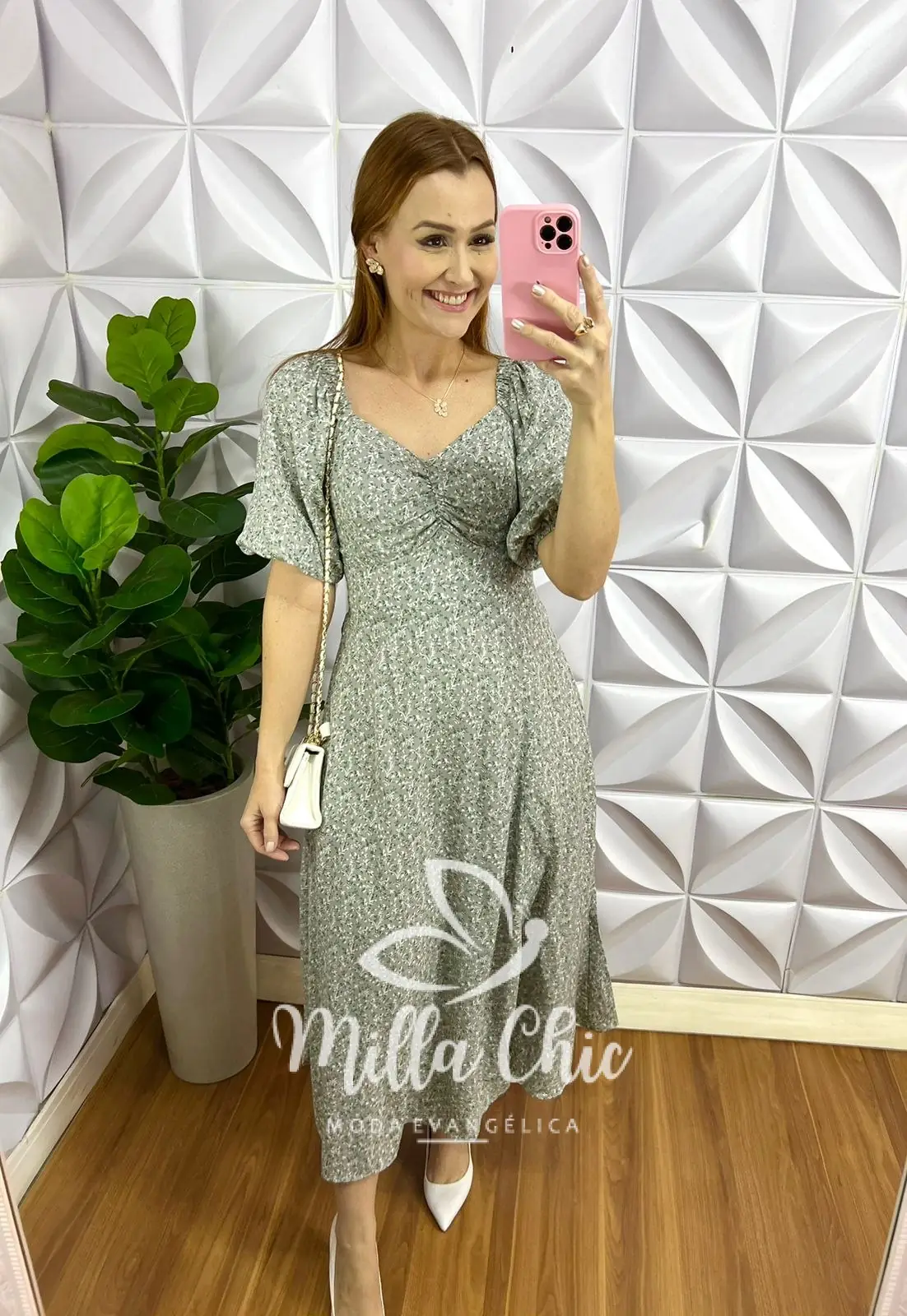 Vestido Viscolinho Mídi Estampado Sheila - Cinza e Verde - Milla Chic