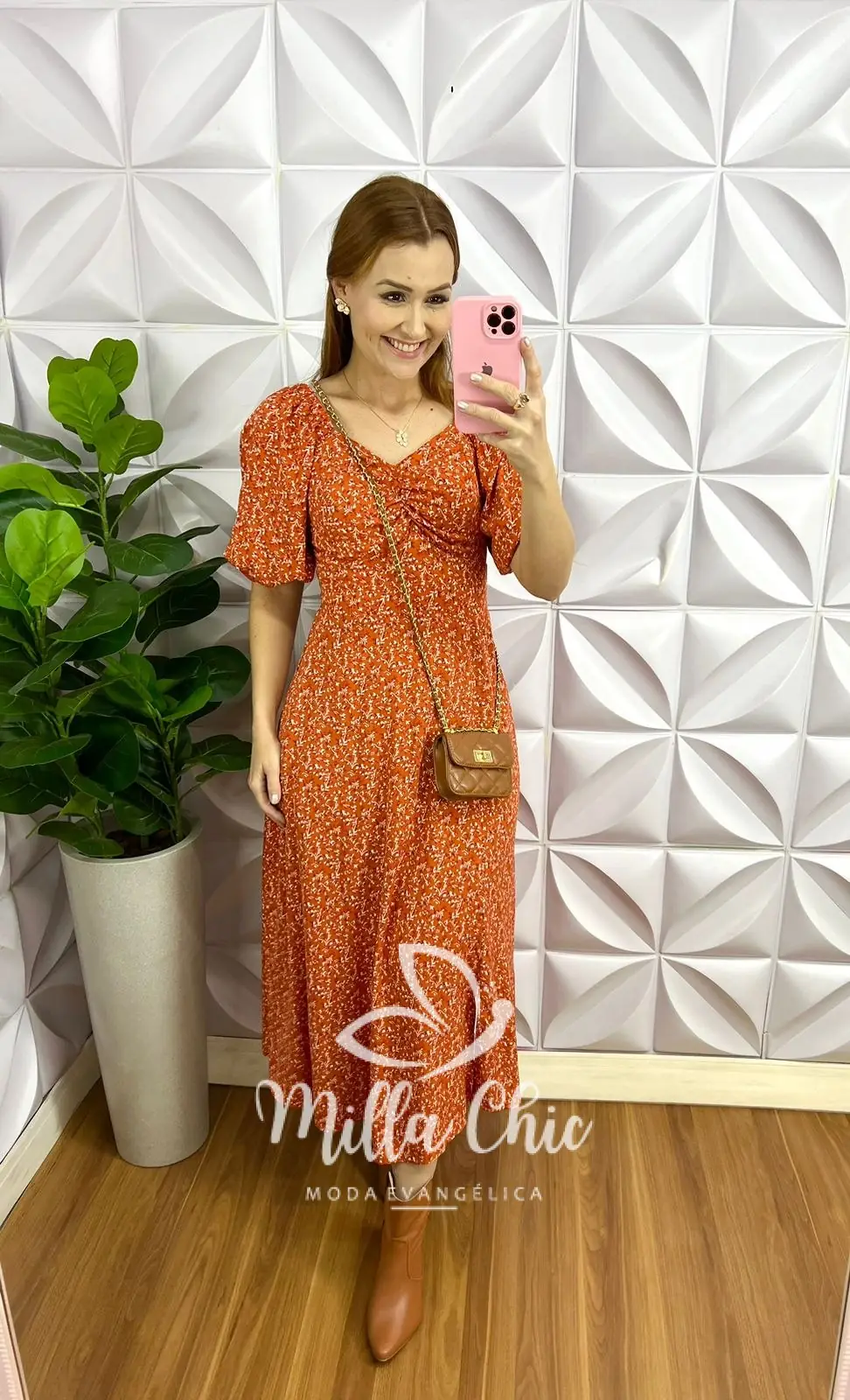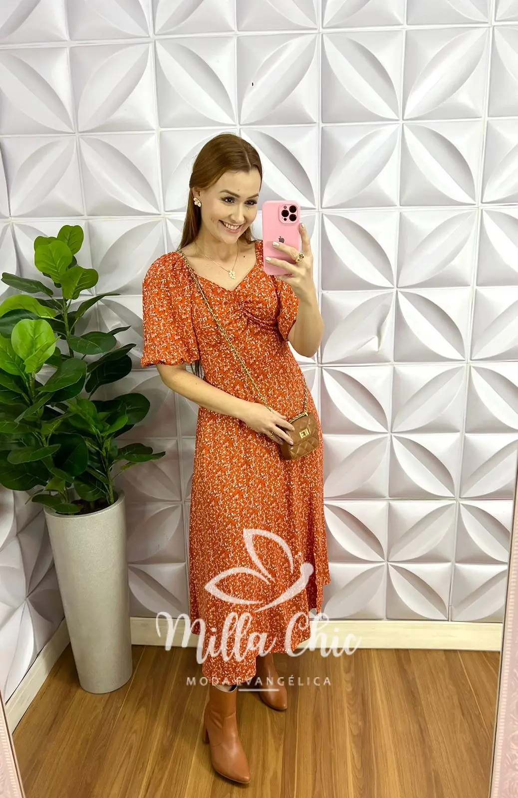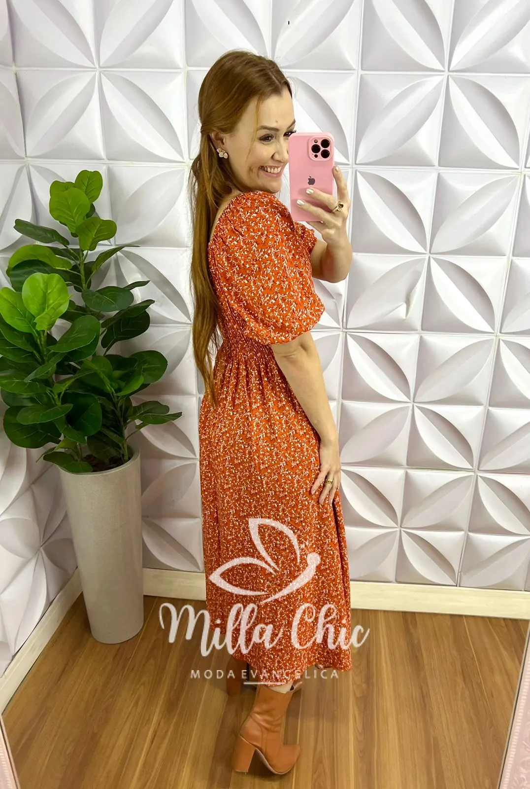 Vestido Viscolinho Mídi Estampado Sheila - Laranja - Milla Chic
